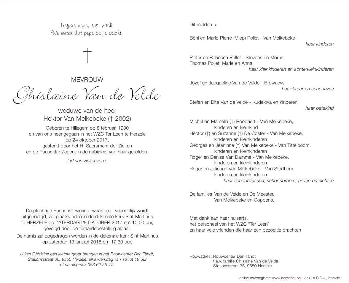 Overleden te Herzele (9550) op dinsdag 24 oktober 2017 op 87-jarige leeftijd