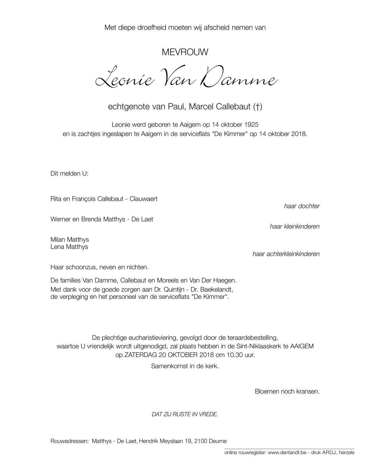 Overleden te Erpe-Mere (9420) op zondag 14 oktober 2018 op 93-jarige leeftijd