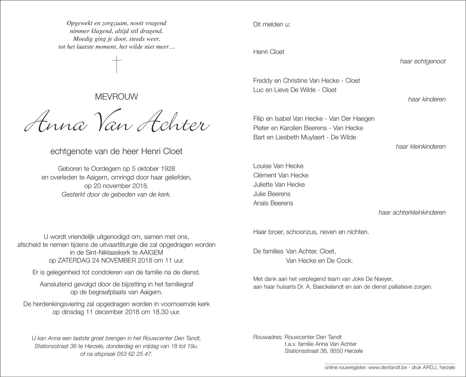 Overleden te Aaigem (9420) op dinsdag 20 november 2018 op 90-jarige leeftijd