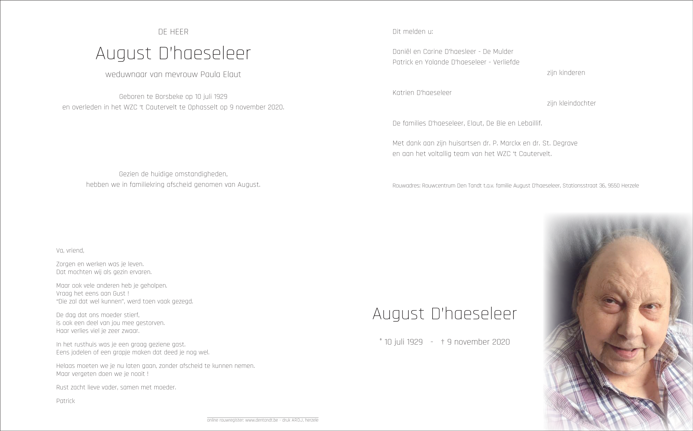 Overleden te Ophasselt (9500) op maandag 9 november 2020 op 91-jarige leeftijd