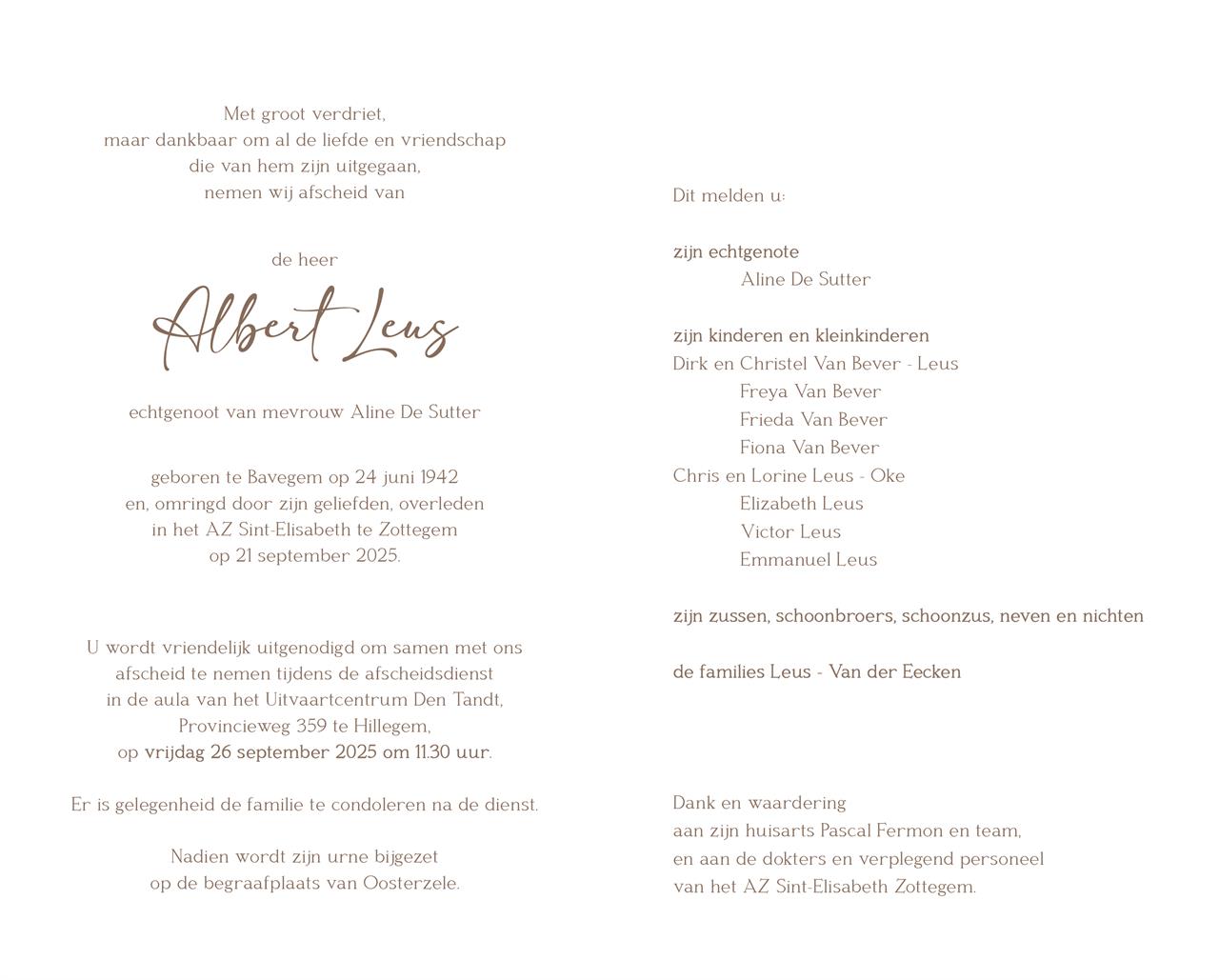 Overleden te Zottegem (9620) op zondag 21 september 2025 op 83-jarige leeftijd