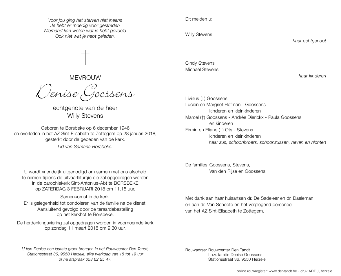 Overleden te Zottegem (9620) op zondag 28 januari 2018 op 71-jarige leeftijd
