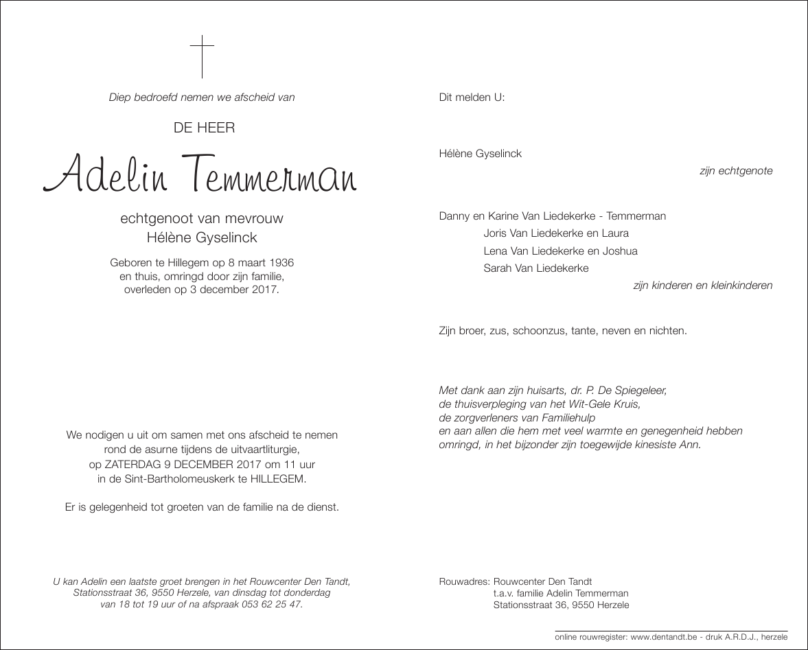 Overleden te Hillegem (9550) op zondag 3 december 2017 op 81-jarige leeftijd