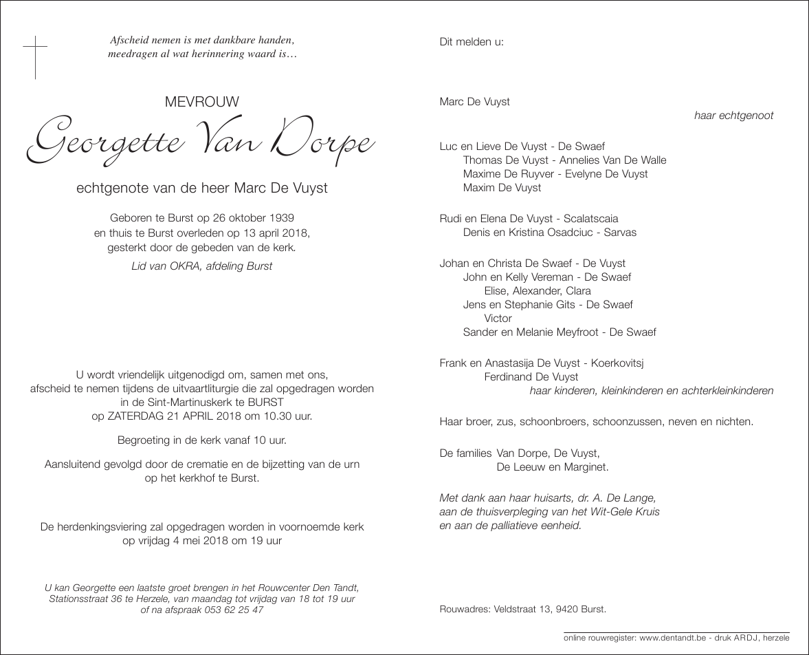 Overleden te Burst (9420) op vrijdag 13 april 2018 op 78-jarige leeftijd