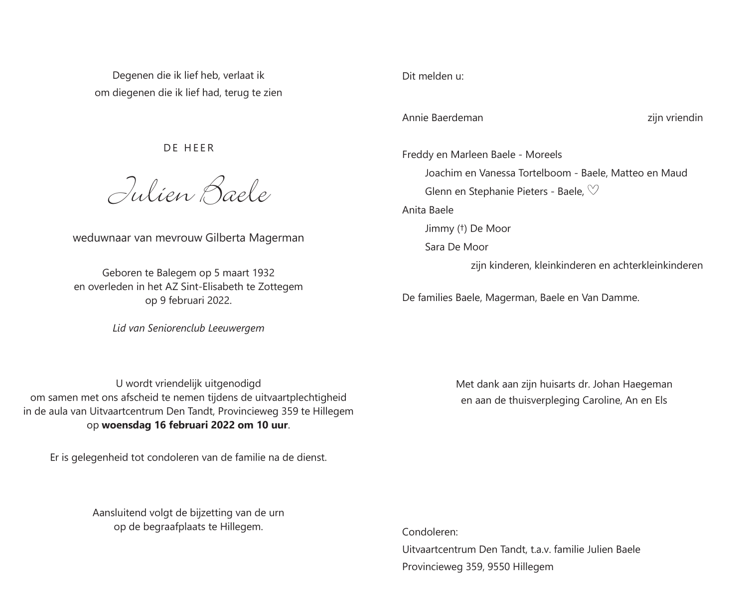 Overleden te Zottegem (9620) op woensdag 9 februari 2022 op 89-jarige leeftijd