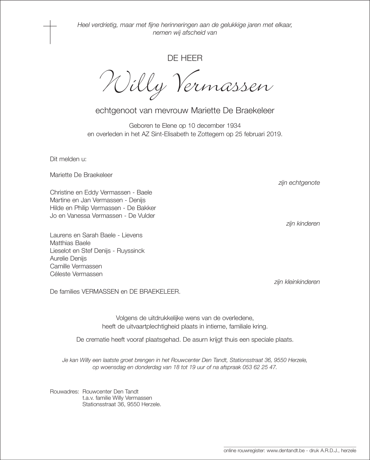 Overleden te Zottegem (9620) op maandag 25 februari 2019 op 84-jarige leeftijd