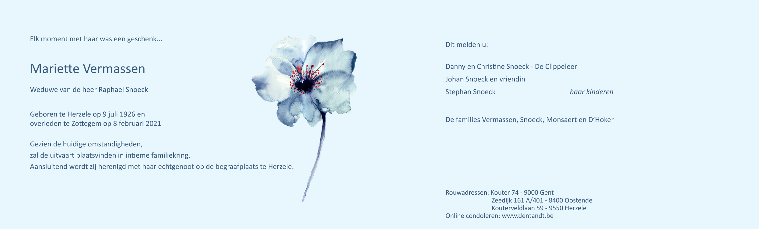 Overleden te Zottegem (9620) op maandag 8 februari 2021 op 94-jarige leeftijd