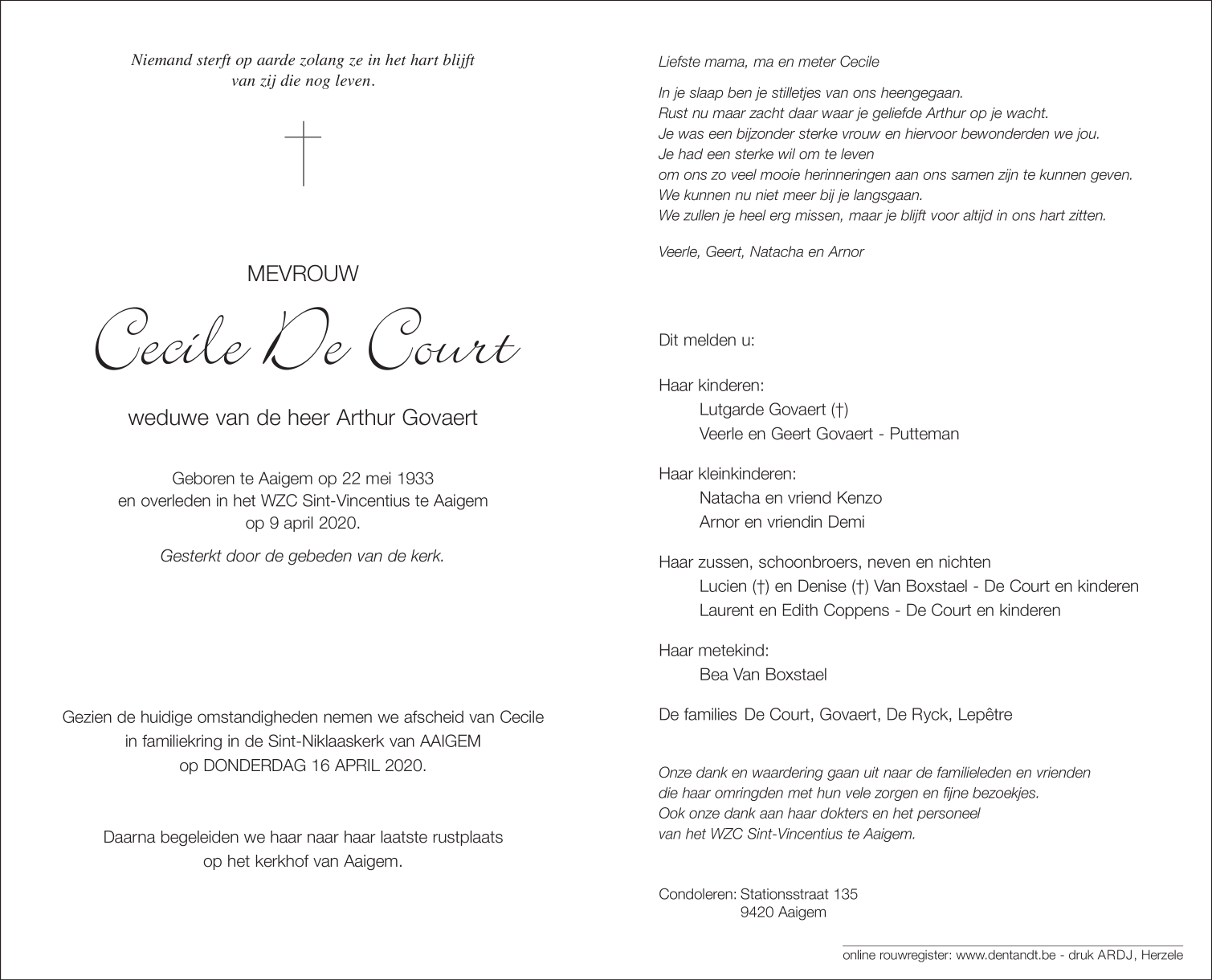 Overleden te Aaigem (9420) op donderdag 9 april 2020 op 86-jarige leeftijd
