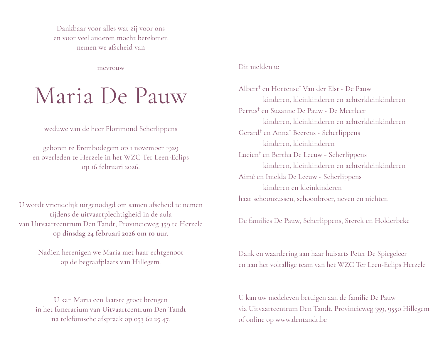 Overleden te Herzele (9550) op maandag 16 februari 2026 op 96-jarige leeftijd