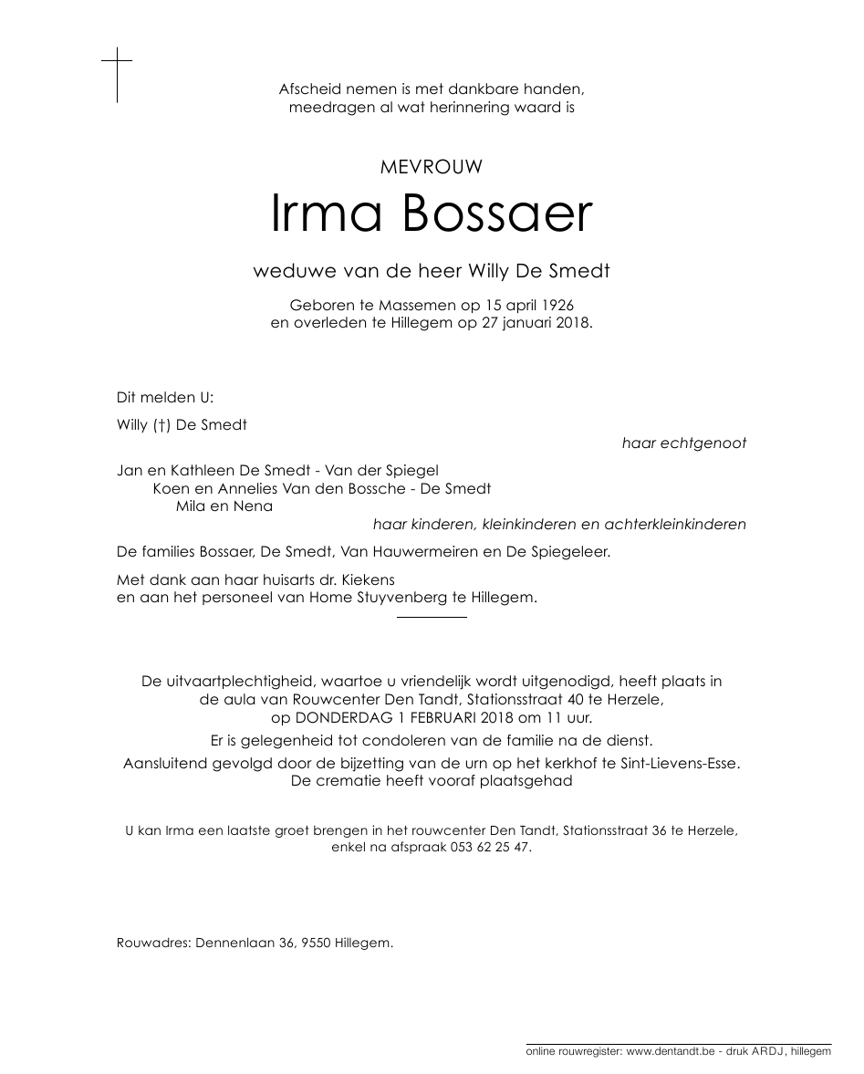 Overleden te Hillegem (9550) op zaterdag 27 januari 2018 op 91-jarige leeftijd