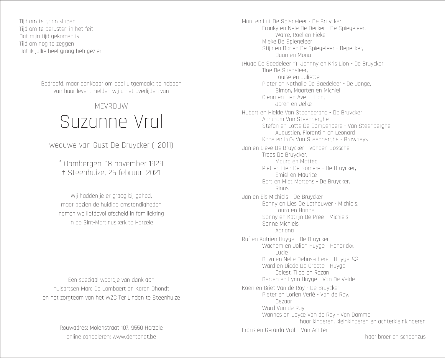 Overleden te Steenhuize-Wijnhuize (9550) op vrijdag 26 februari 2021 op 91-jarige leeftijd