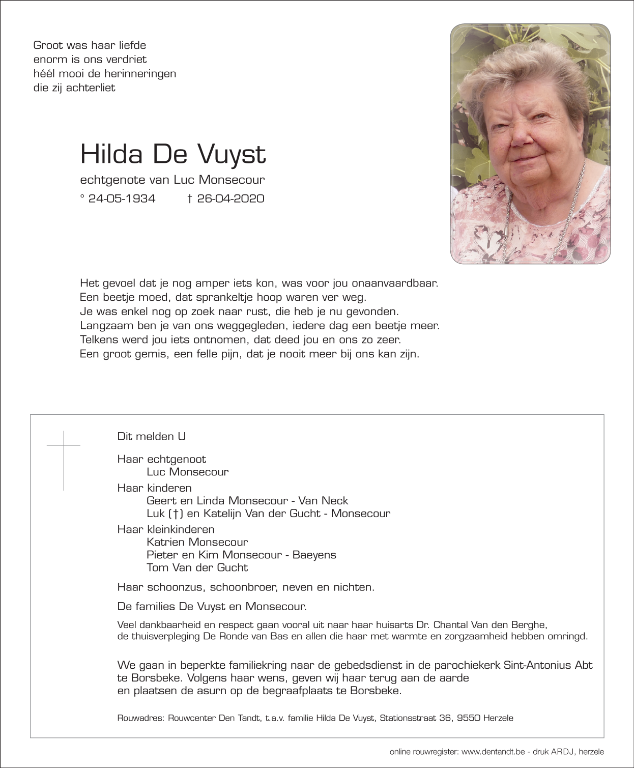 Overleden te Borsbeke (9552) op zondag 26 april 2020 op 85-jarige leeftijd