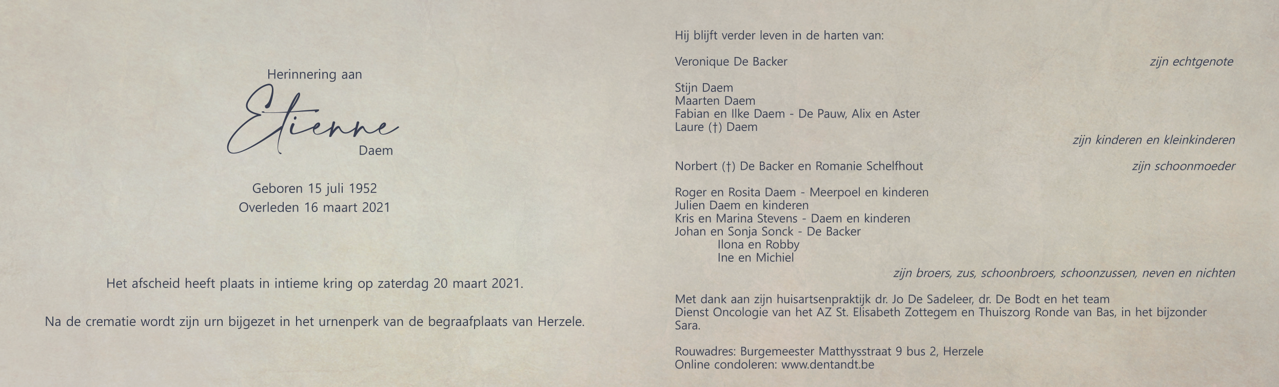 Overleden te Herzele (9550) op dinsdag 16 maart 2021 op 68-jarige leeftijd