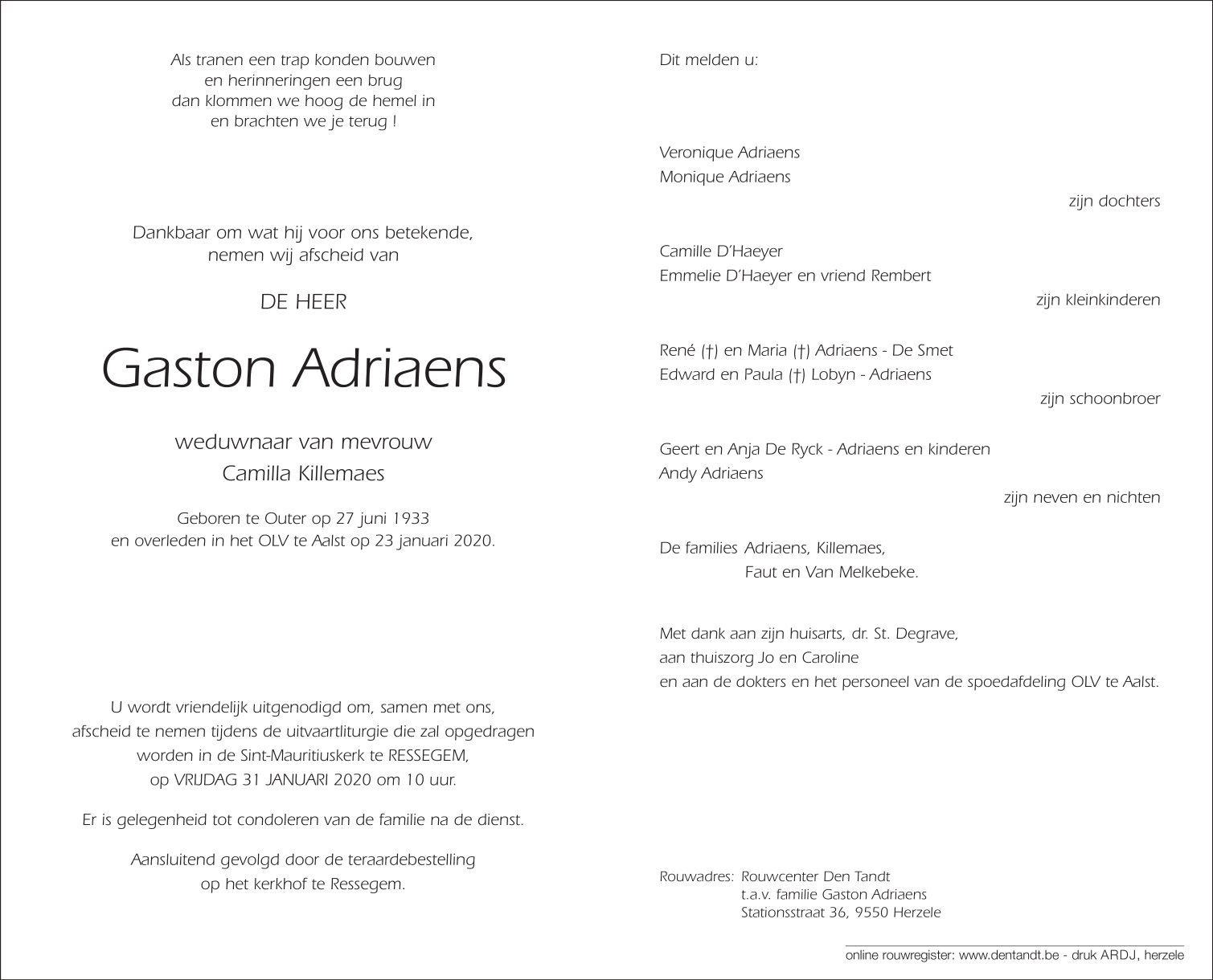 Overleden te Aalst (9300) op donderdag 23 januari 2020 op 86-jarige leeftijd