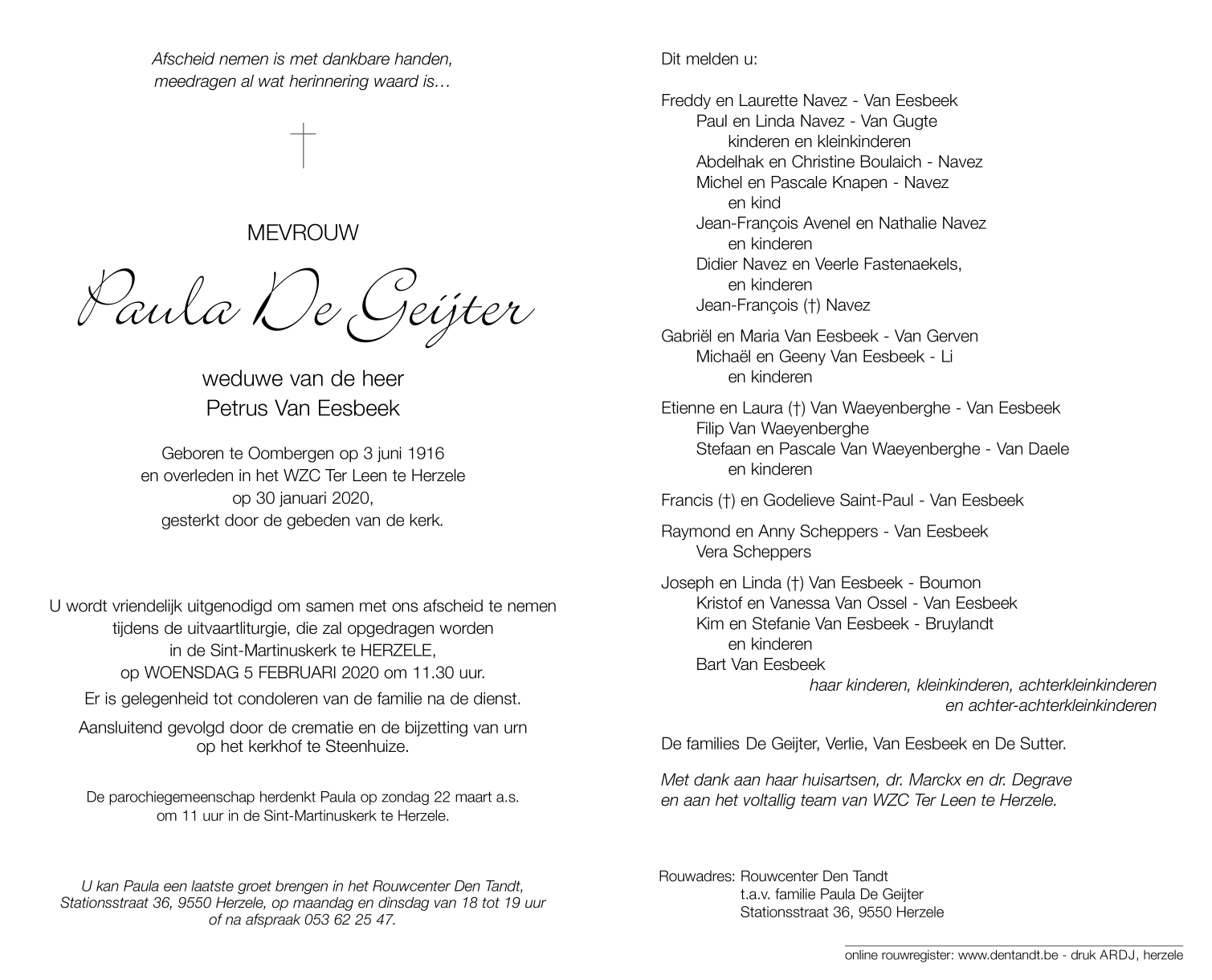Overleden te Herzele (9550) op donderdag 30 januari 2020 op 103-jarige leeftijd