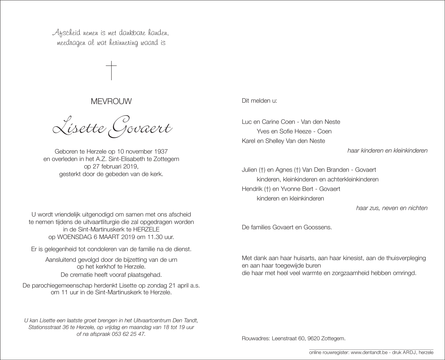 Overleden te Zottegem (9620) op donderdag 28 februari 2019 op 81-jarige leeftijd